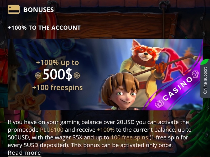 The casino also provides the possibility of getting free spins of Gonzo’s Quest. For every 5 dollars we get one additional, free spin – we can finally get as many as 100. The rules of using spins are also simple and not very demanding. To be able to pay won funds from free spins, you must turn only 35 times.